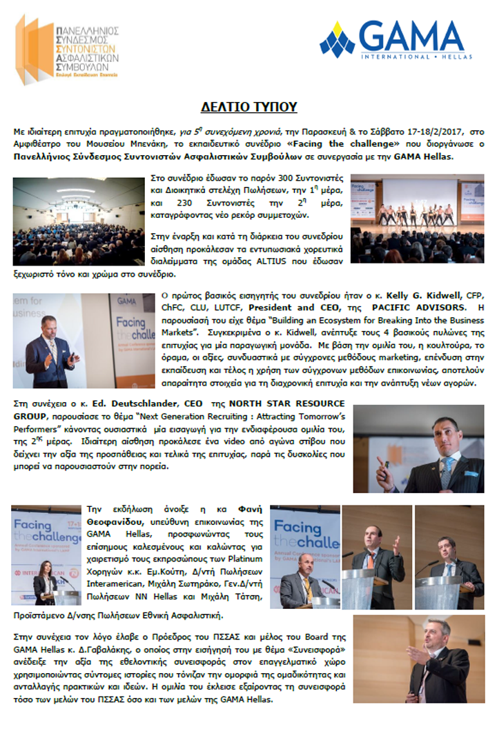 Με μεγάλη επιτυχία σημειώθηκε το διήμερο εκπαιδευτικό συνέδριο του ΠΣΣΑΣ σε συνεργασία με την GAMA Hellas, που έλαβε χώρα στις 17 & 18/2/2017 στο Αμφιθέατρο του Μουσείου Μπενάκη, με τίτλο “Facing the challenge”. Για πρώτη φορά το συνέδριο πραγματοποιήθηκε με την υποστήριξη του LAMP της GAMA International.