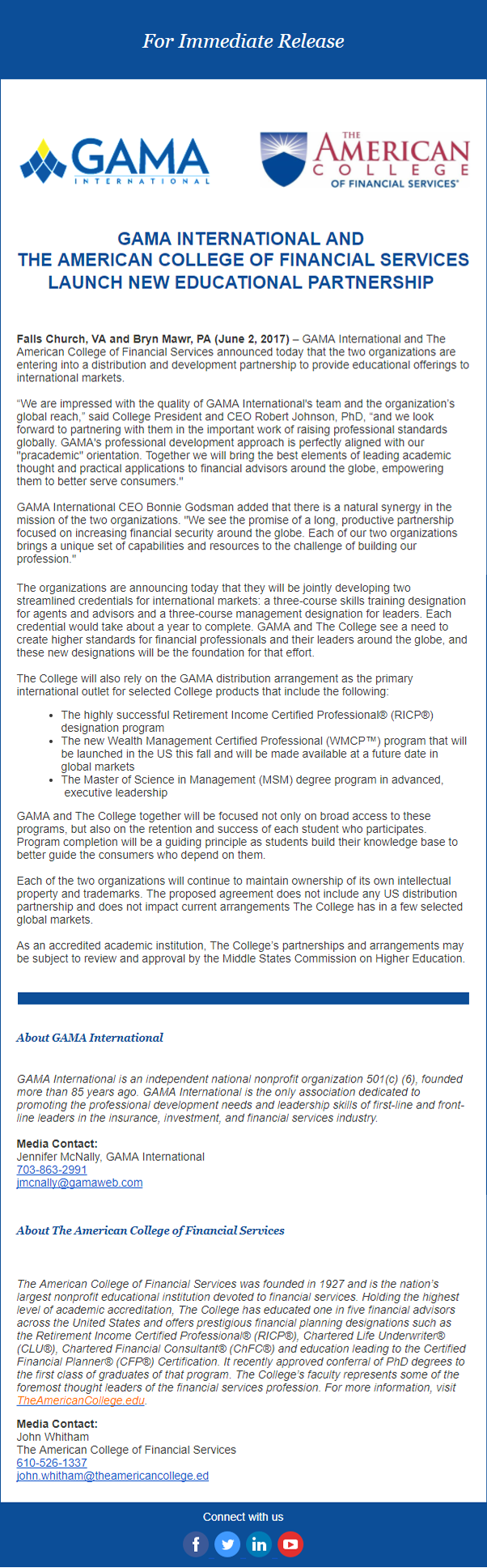 Με χαρά ανακοινώνουμε τη νέα Εκπαιδευτική Συνεργασία ανάμεσα στην GAMA International και το The American College of Financial Services που αφορά 3 νέα προγράμματα πιστοποίησης.