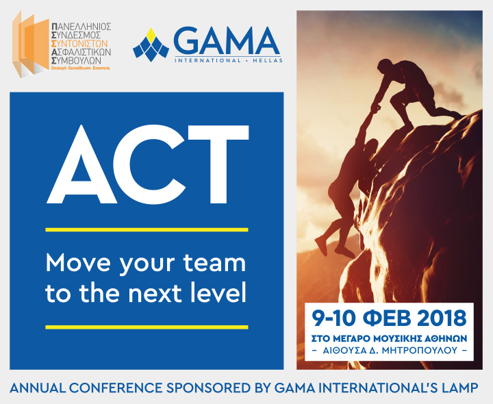 Ο ΠΣΣΑΣ σε συνεργασία με την GAMA Hellas διοργανώνει εκπαιδευτικό συνέδριο στις 9 & 10/2/2018, στην αίθουσα «Δημήτρης Μητρόπουλος» του ΜΕΓΑΡΟΥ ΜΟΥΣΙΚΗΣ ΑΘΗΝΩΝ με τίτλο "ACT – Move your team to the next level" με επίκεντρο τις νέες τάσεις και προκλήσεις στην Ασφαλιστική αγορά. Δείτε το Δελτίο Τύπου εδώ.